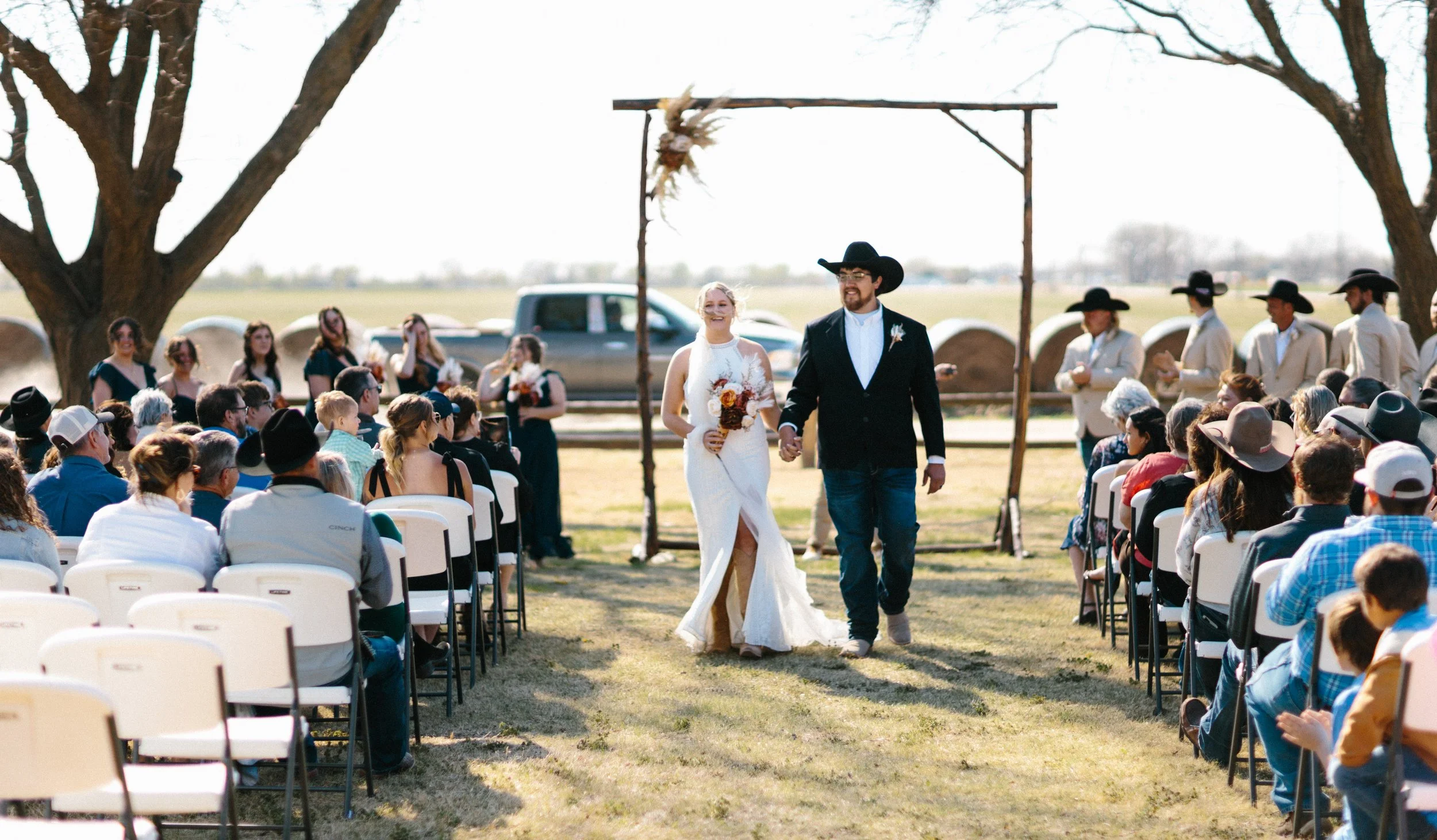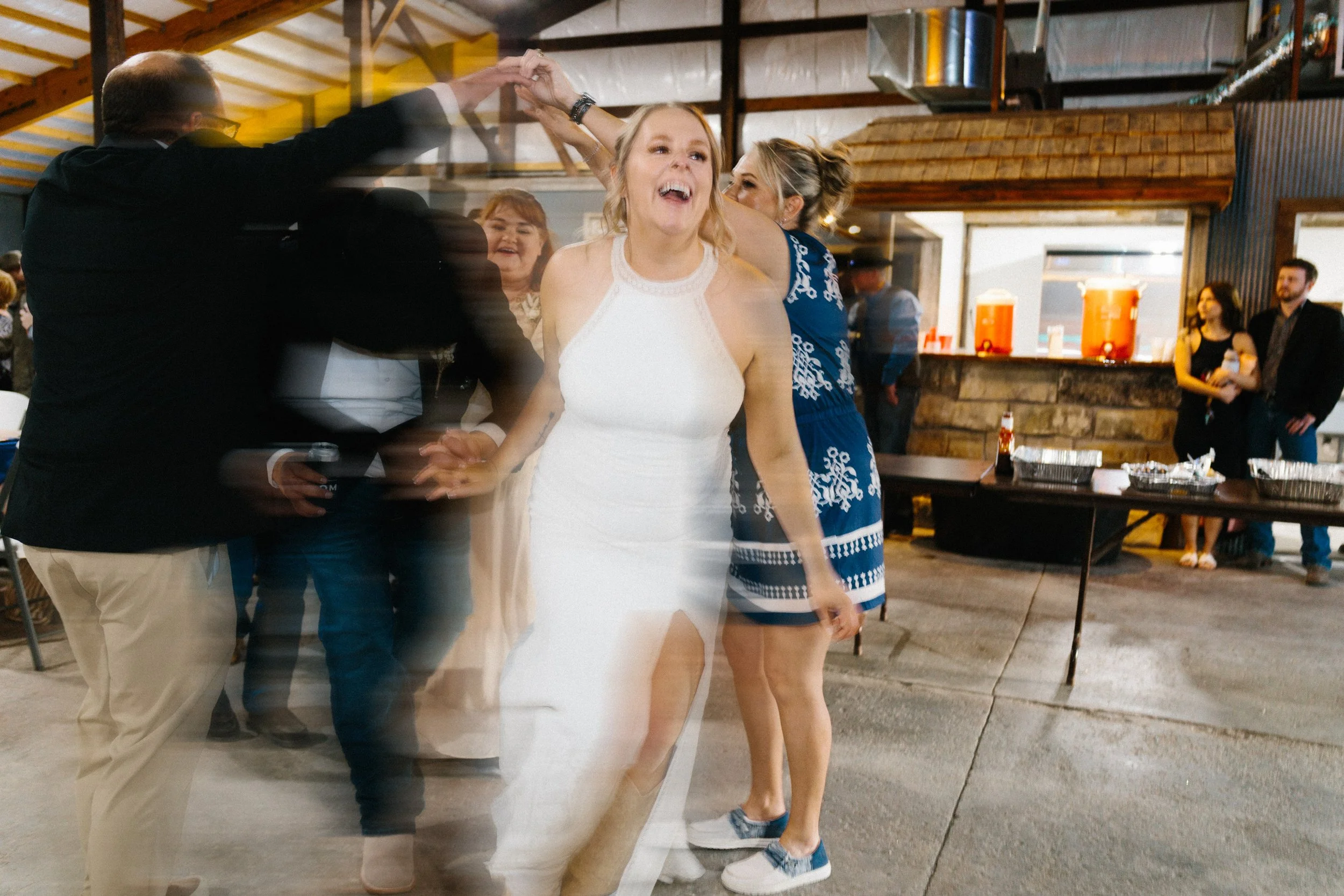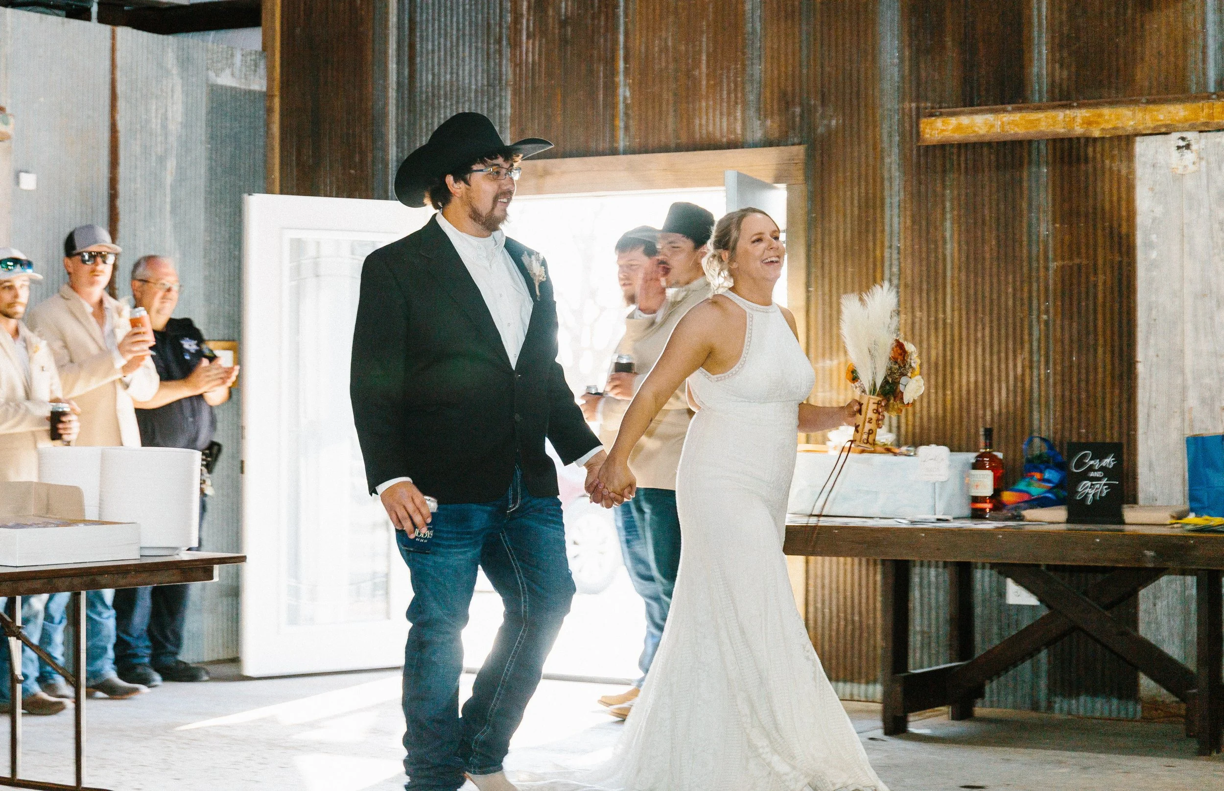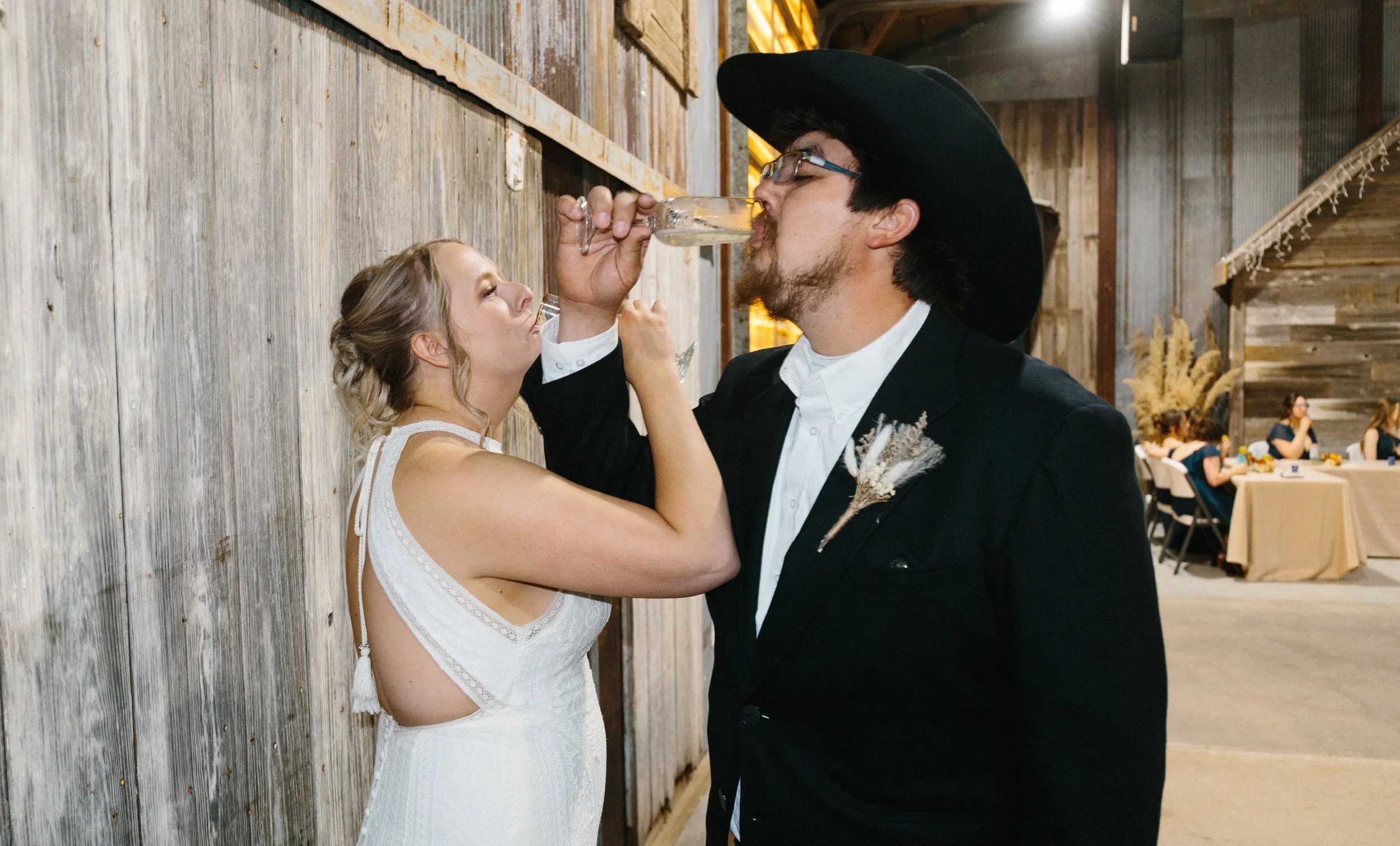 Their ceremony took place outdoors, with the Kansas wind making its presence known, but the temperature turned out to be just about perfect for early spring. Afterward, everyone gathered inside the venue’s rustic barn for a reception full of charm, laughter, and the kind of energy that makes a wedding unforgettable. Between the closeness of their family and friends, the constant silliness, and the wild games that kicked off after the first dances, Blaiz and Lara’s wedding felt like a true celebration in every sense of the word.